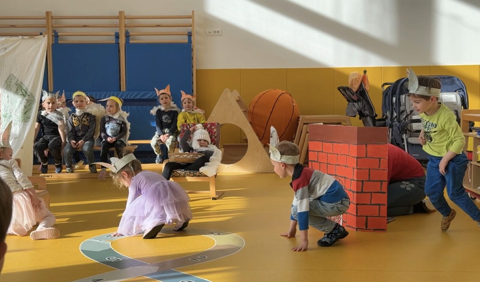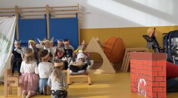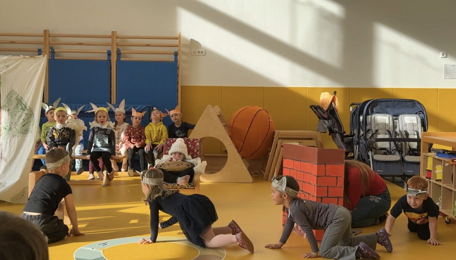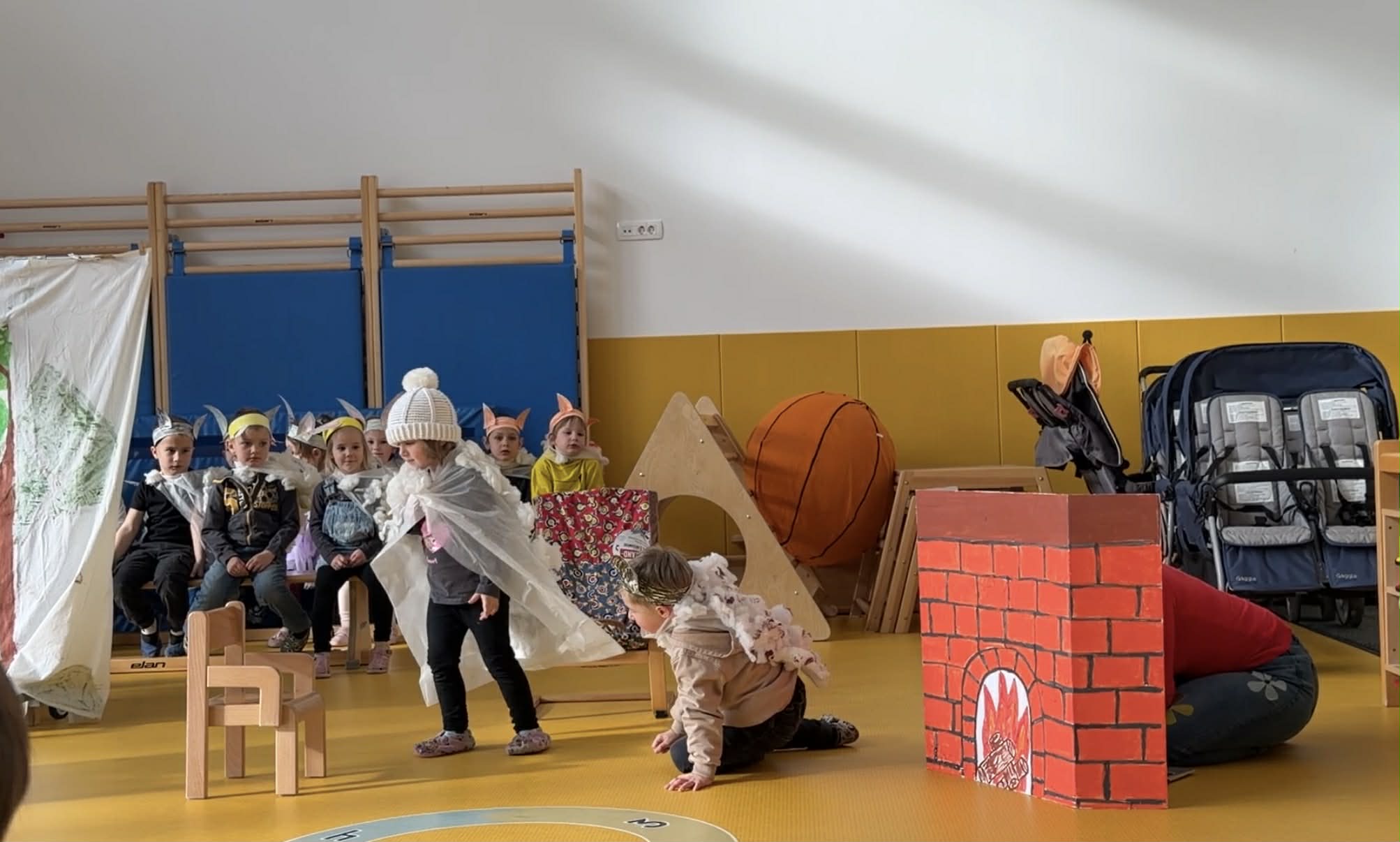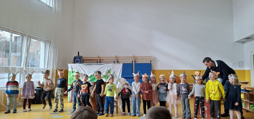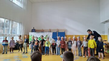 Vzgojitelja sta nam povedala, da so najprej spoznavali vsebino pravljice, se naučili otroško pesmico z naslovom”Babica Zima”, si izdelali ušesa in tople kožuhe, nato pa se preizkusili v vlogi igralcev. Izdelali so si tudi igralsko sceno. Ko so postali že pravi igralci, so dramatizacijo zaigrali tudi ostalim skupinam v vrtcu.