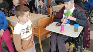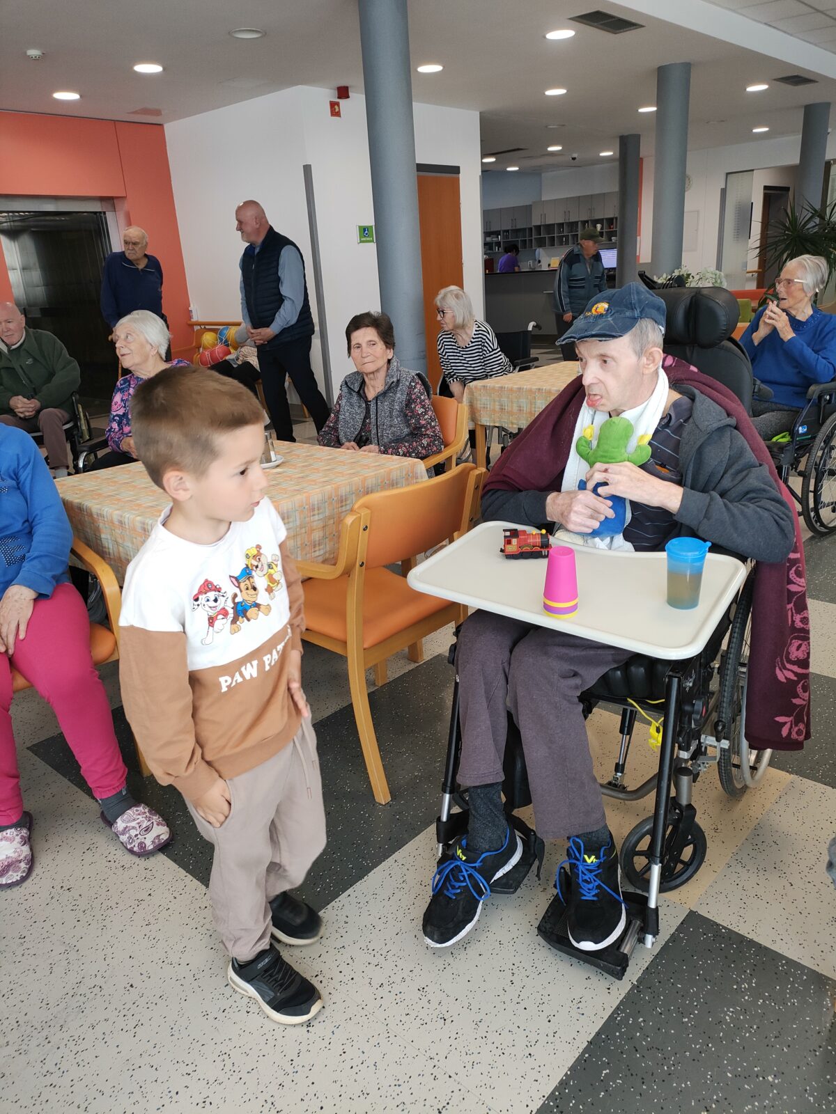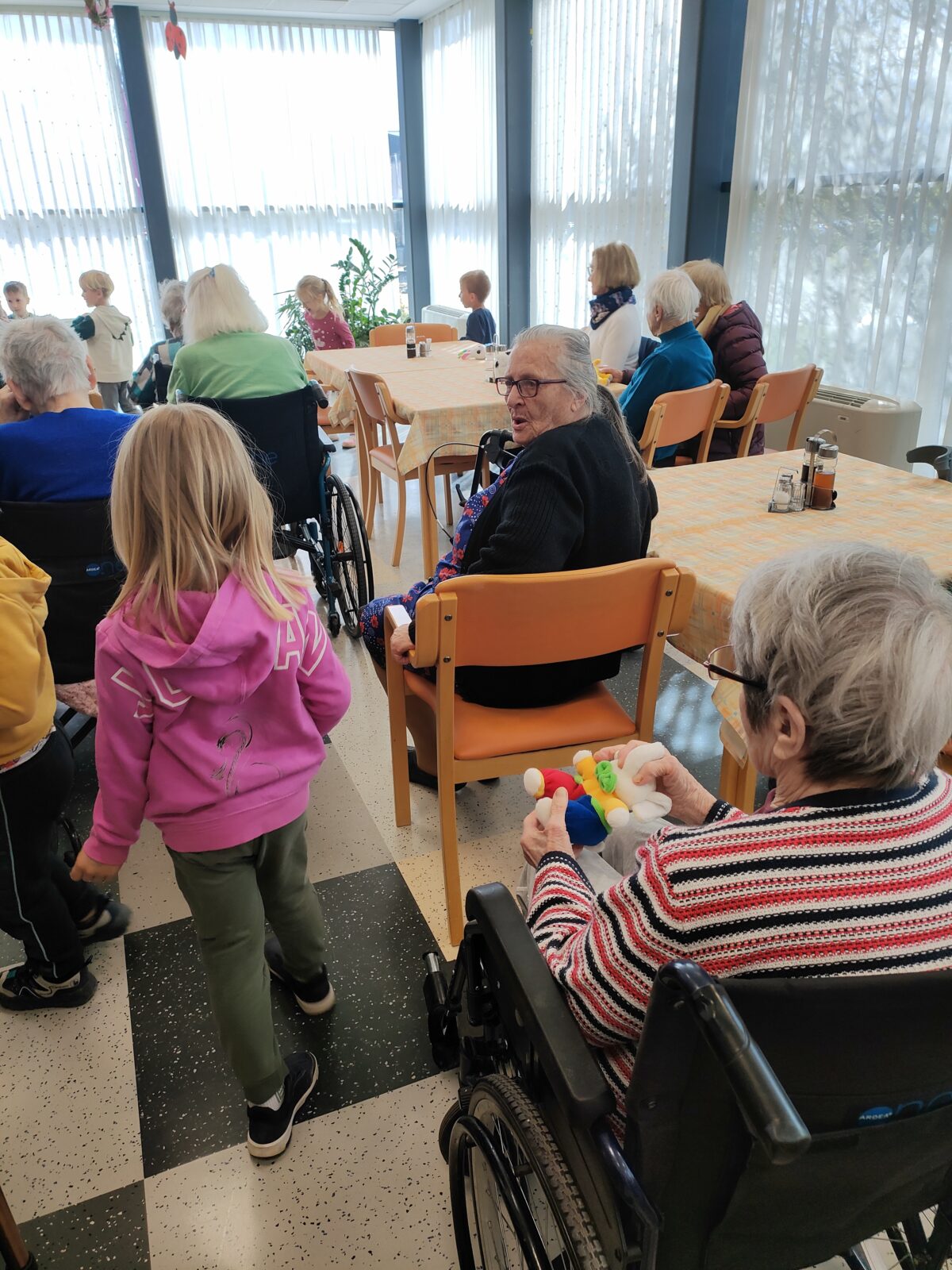 Varovanci so nas prijazno pričakali v skupnem prostoru. Otroci so jim z velikim ponosom, veseljem in rahlim vznemirjenjem izročili svoje plišaste igrače. Ob tem smo lahko opazili veliko topline, hvaležnosti in nasmehov na obrazih stanovalcev doma. S svojo gesto so otroci varovance zelo razveselili in jim polepšali dan. Skupaj smo zapeli tudi nekaj pesmic, pri katerih so se nam varovanci z veseljem pridružili. S skupnim petjem smo ustvarili prijetno in sproščeno vzdušje ter okrepili medgeneracijsko povezovanje. Prav tako smo na ta dan ozaveščali pomen medgeneracijskega druženja. Pri medgeneracijskem druženju gre za povezovanja med generacijami, predvsem gre za medčloveški odnos in uresničevanje medgeneracijske solidarnosti v današnjih družbenih razmerah. Medgeneracijsko povezovanje zagotavlja občutek sprejetosti in varnosti tako starejših ljudi kot mlajših otrok.