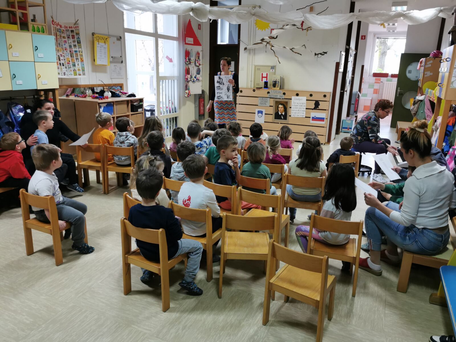 Najprej smo poslušali slovensko himno. Nato sta nam skozi zanimivo in otrokom razumljivo zgodbo ter slikopis predstavili življenje našega največjega pesnika Franceta Prešerna. Povedali sta nam veliko zanimivosti o njegovem življenju in ustvarjanju.