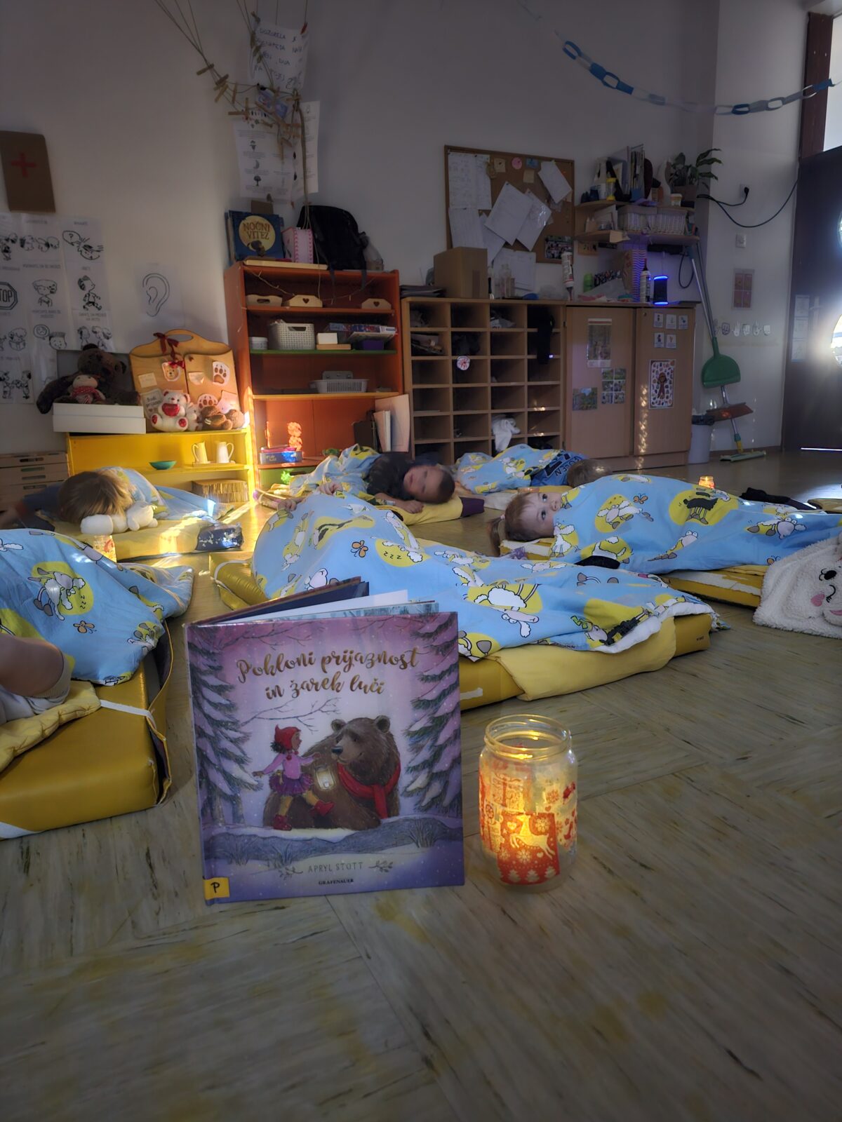 Ob zgodbi smo ustvarili posebno umirjeno vzdušje. Otroci so izdelovali lanternice, skupaj obedovali in počivali ob soju svetlobe iz lanternic. V takšnem okolju smo zgodbo poslušali, se umirili in si vzeli čas za počitek. Zgodba nosi močno sporočilo, da že majhna dejanja prijaznosti lahko postanejo žarek luči za drugega, kar so otroci doživeli skozi pogovor, igro in skupno izkušnjo.